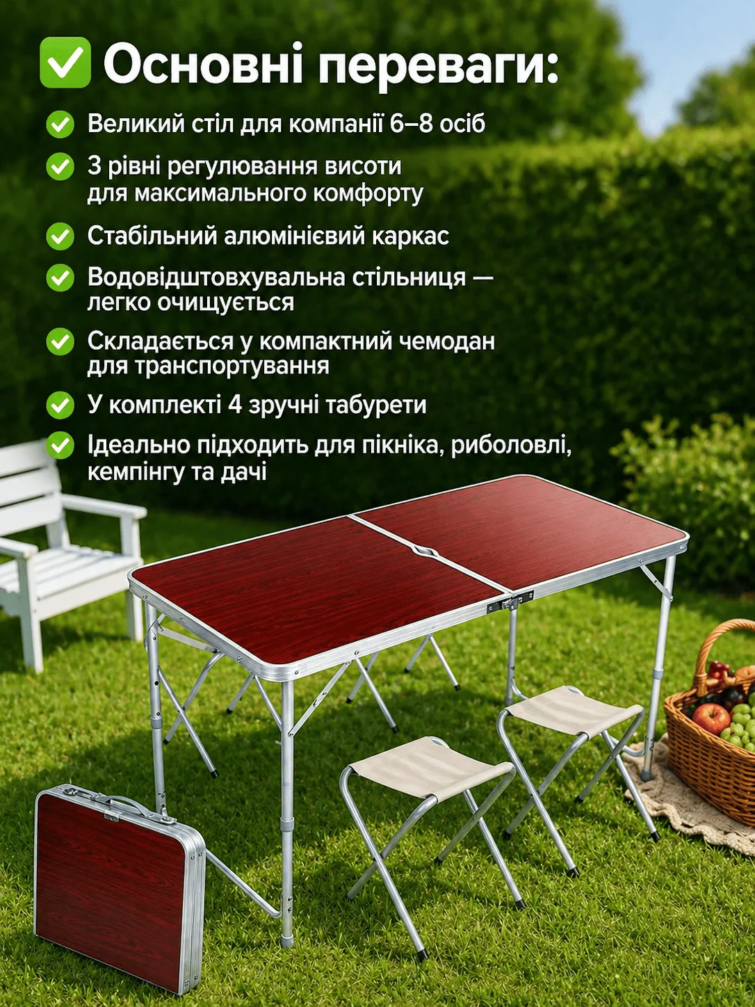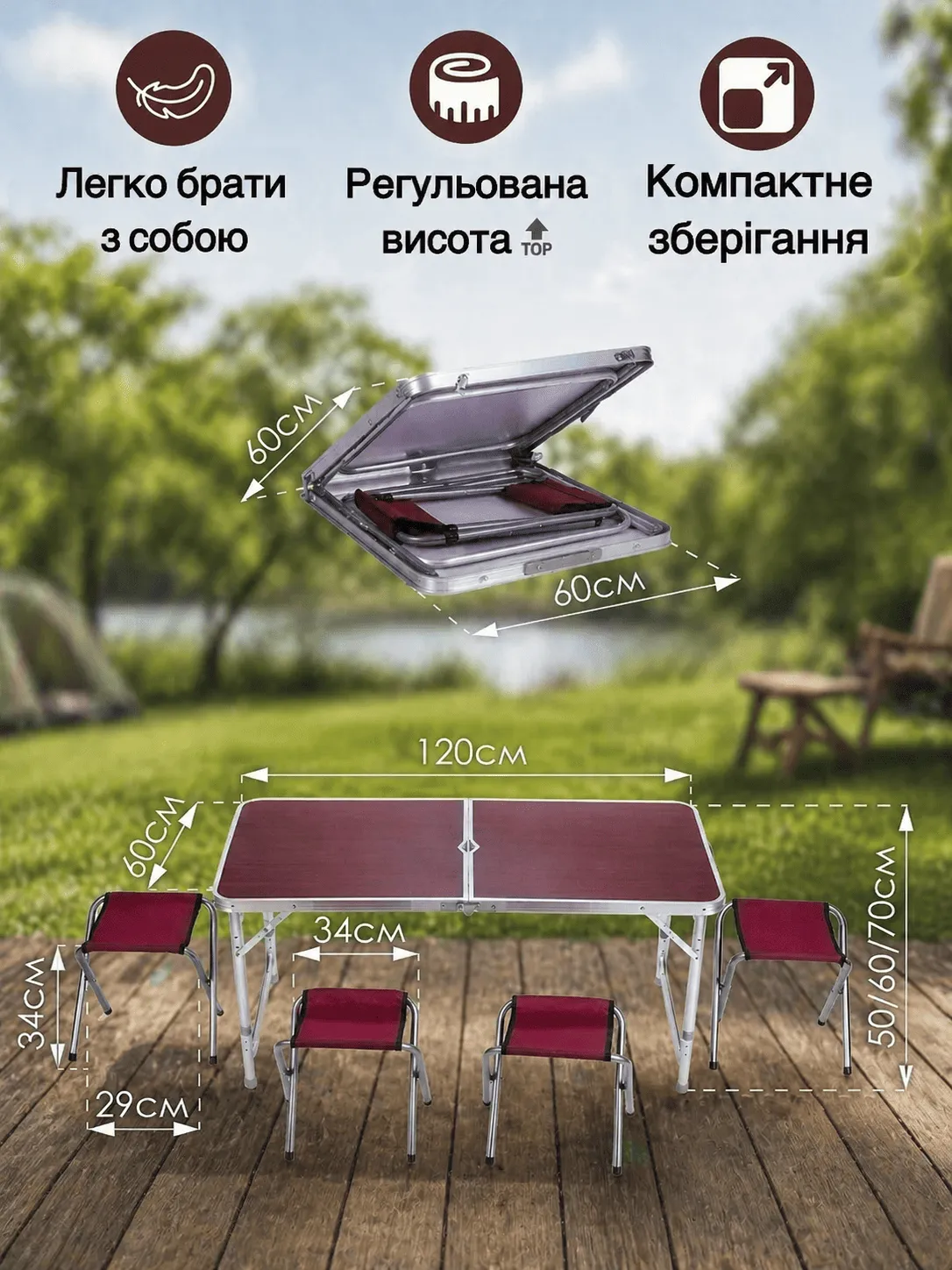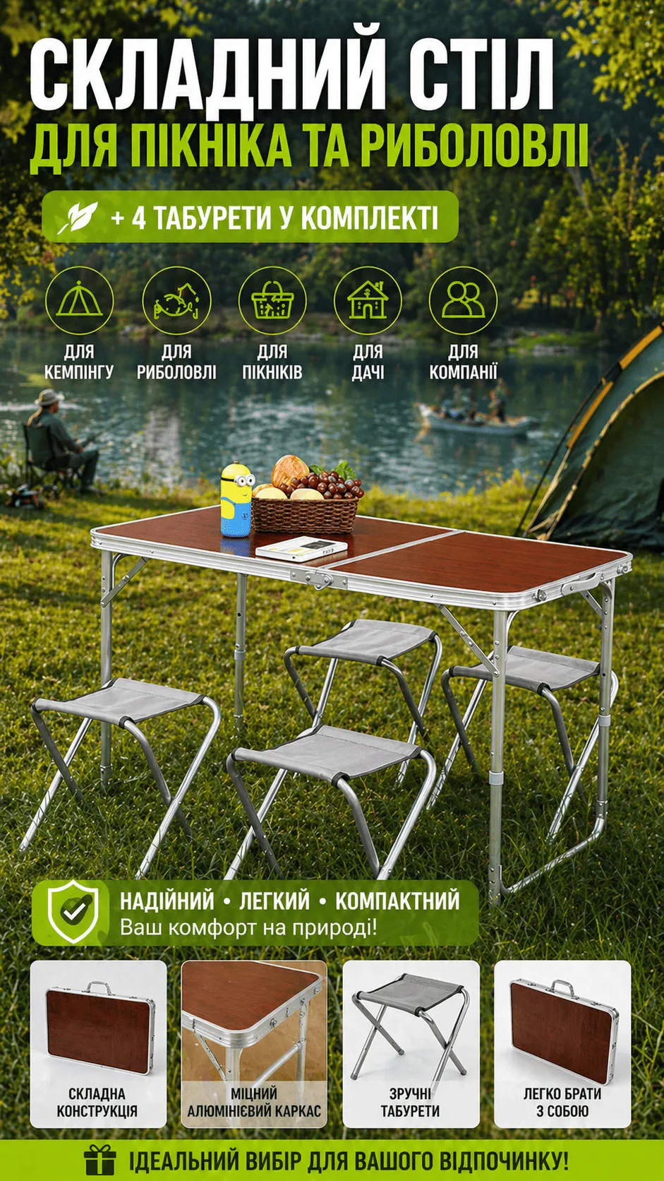 Брала на подарунок чоловіку, він у захваті! Стіл легкий, навіть я можу його спокійно нести за ручку, як чемоданчик. Вже випробували на вихідних: стільці зручні, стіл міцний. Тепер друзі хочуть і собі такий самий